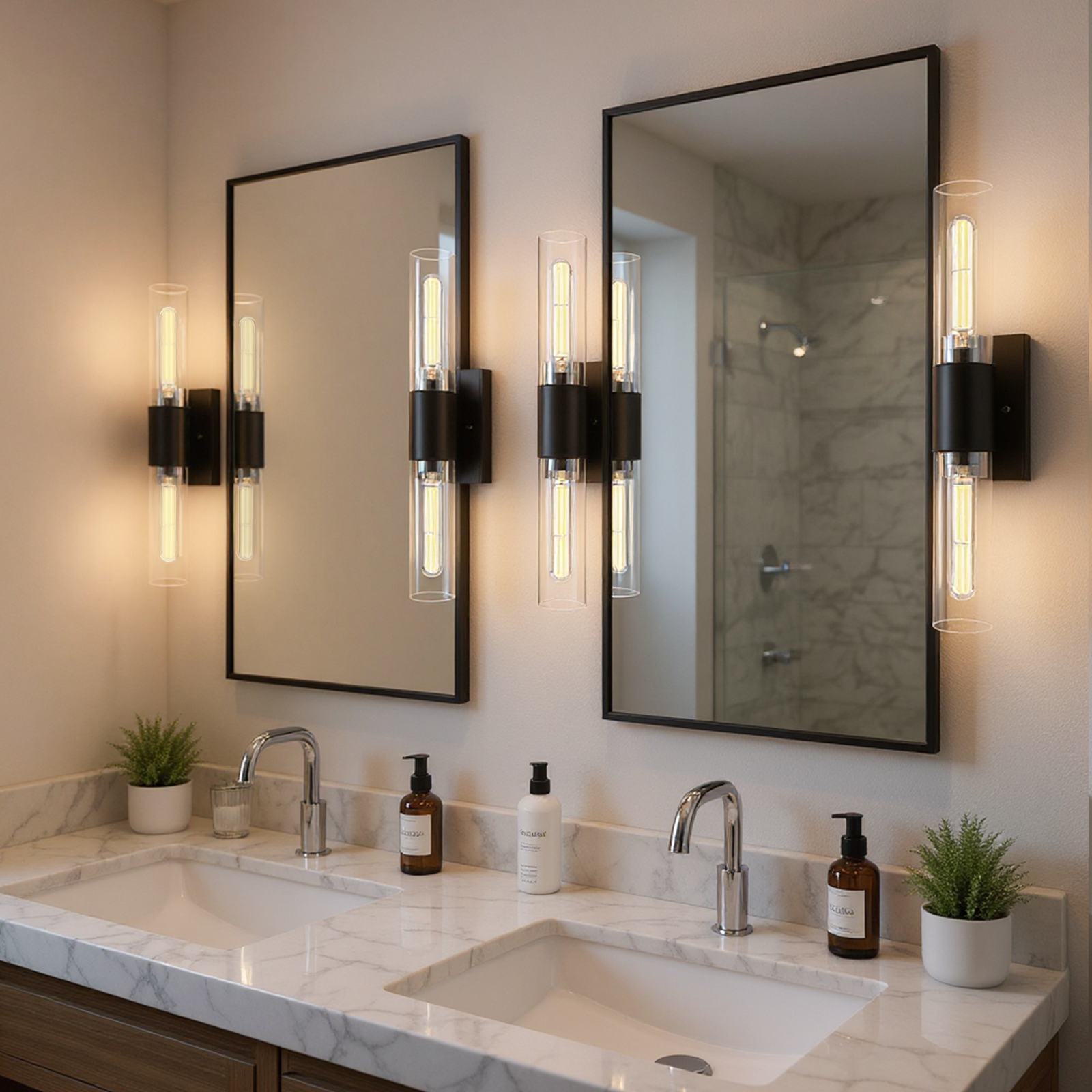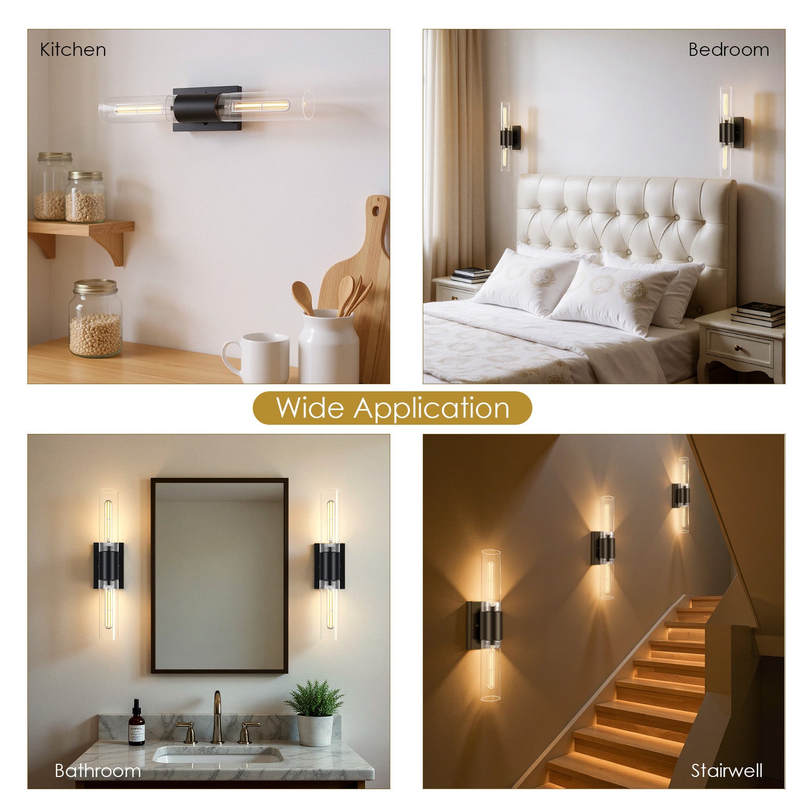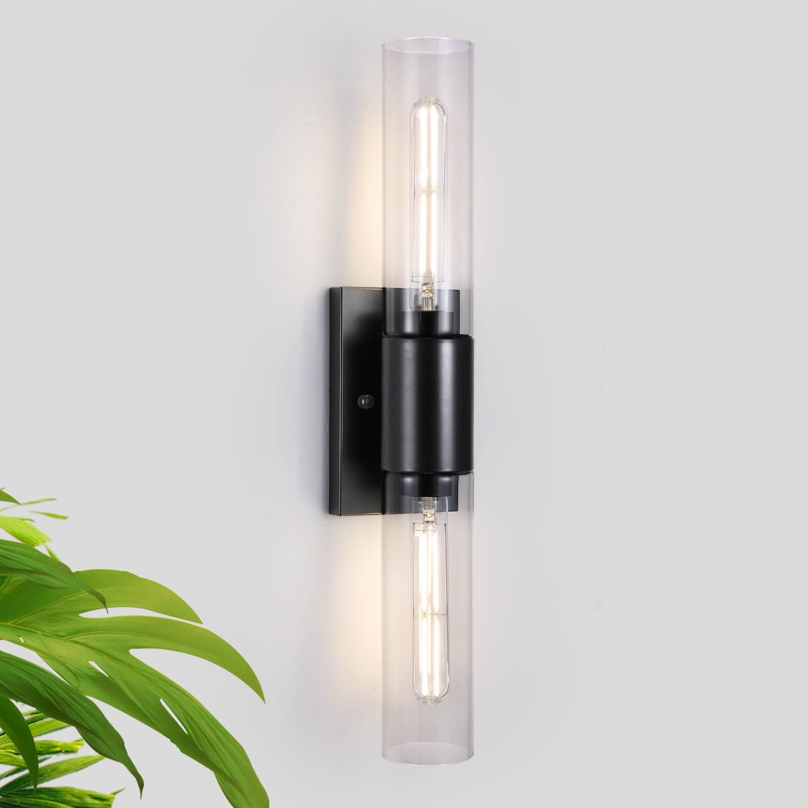 【Elegant Two-Light Wall Sconce】 – Enhance your space with this stylish two-light sconces wall lighting featuring a matte black rectangular backplate and long clear glass tube shades. The bathroom vanity lights in clean & modern design blends seamlessly with both contemporary and traditional decor, making it a perfect choice for bathrooms, living room, bedrooms, hallways, or entryways