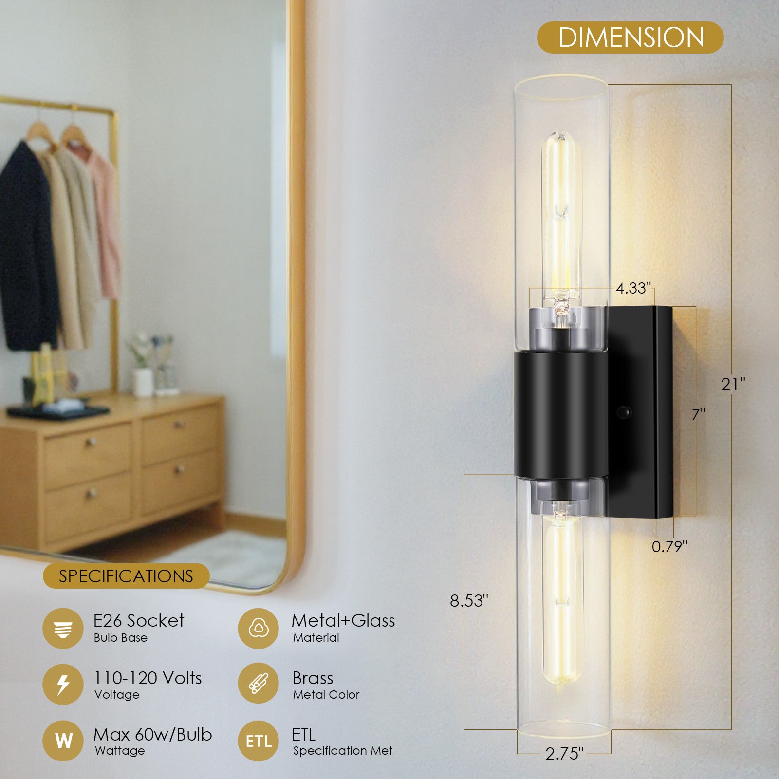 【Ideal Dimensions for Versatile Placement】 – The bathroom wall sconces with a total fixture length of 21 inches and a backplate measuring 4.3"L x 7"H, this modern wall sconce provides balanced illumination without overwhelming your space. The 2x8.5-inch-long glass shades (2.7" diameter) distribute light beautifully, making it an excellent choice for vanity mirrors, bathroom walls, or hallway accent lighting