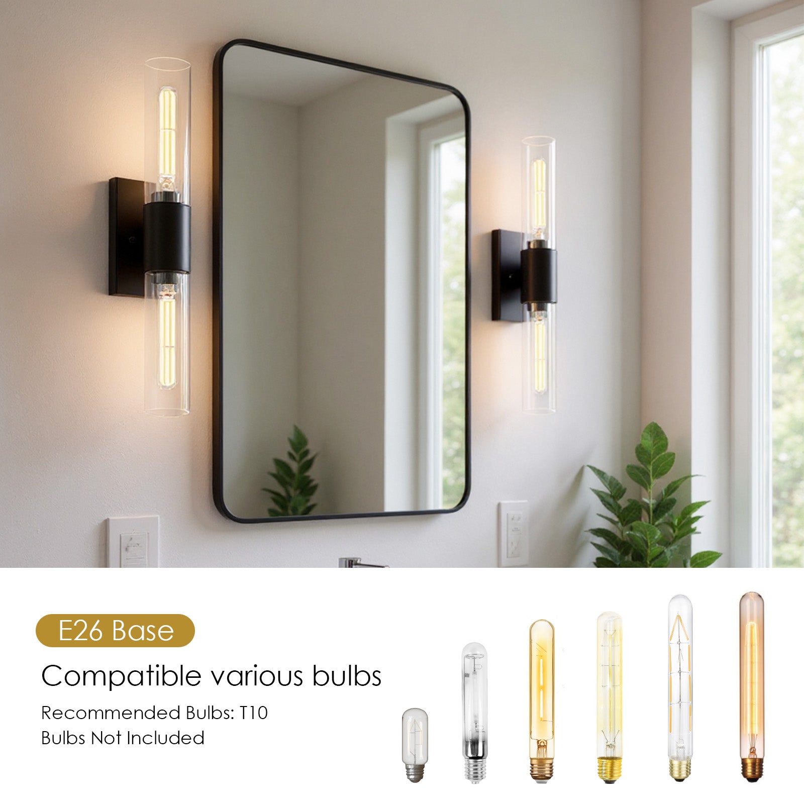 【Simple & Hassle-Free Installation】 – Designed for easy setup, this black vanity light comes with all necessary mounting hardware and straightforward instructions. The bathroom light fixtures allowing you to customize brightness with incandescent, LED, or CFL options, uses 2*Max 60W T10 bulbs, fully dimmable when used with dimmable bulbs and compatible dimmer switches (Bulb and dimmer switch excluded)
