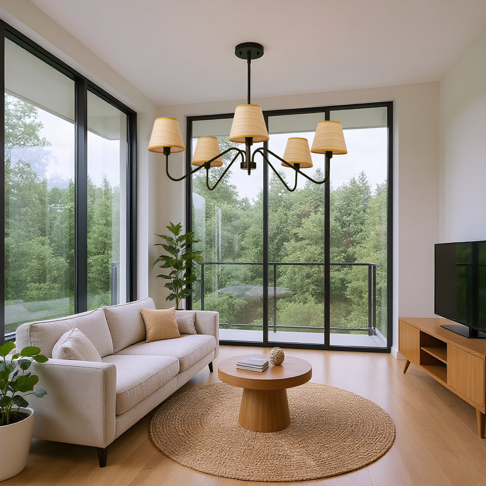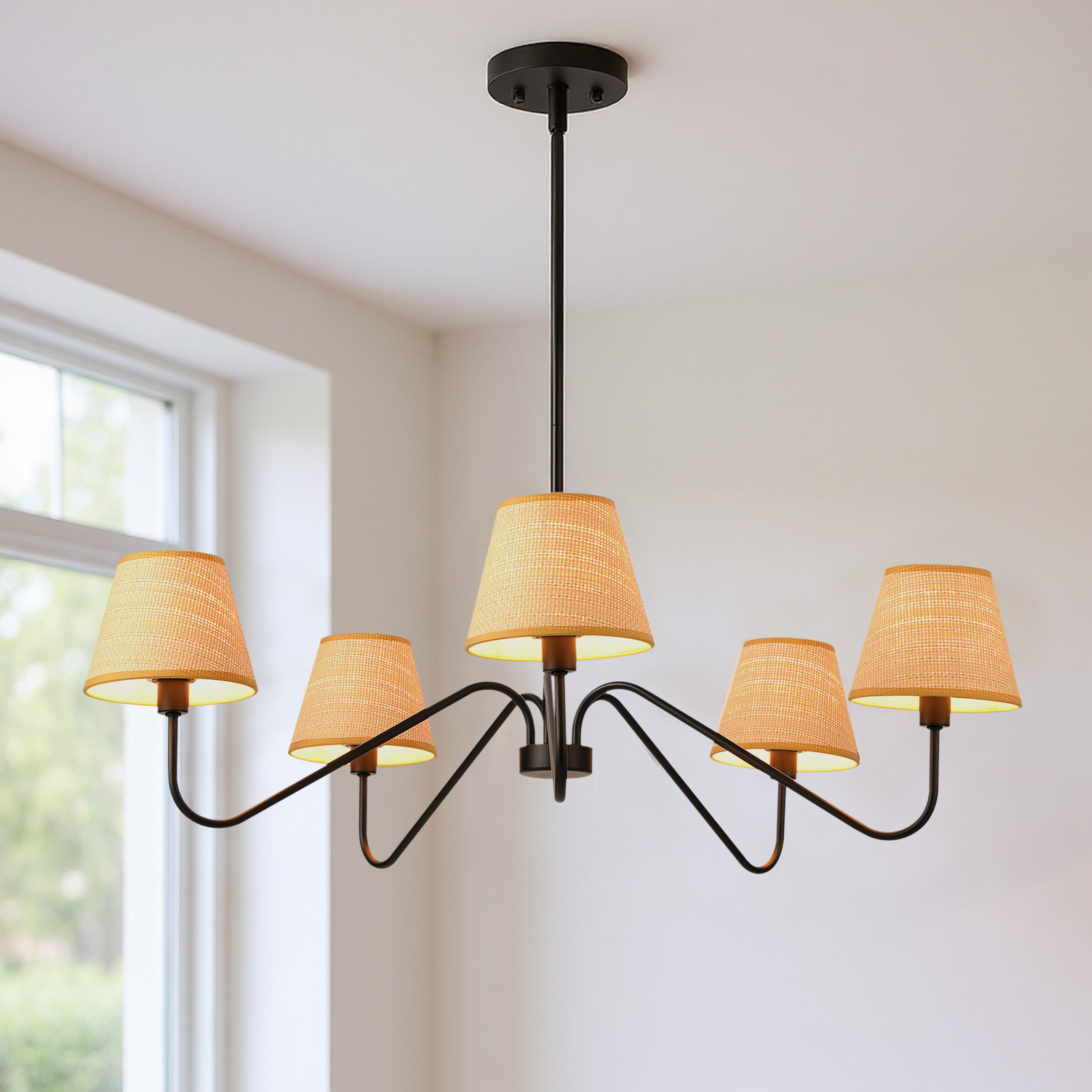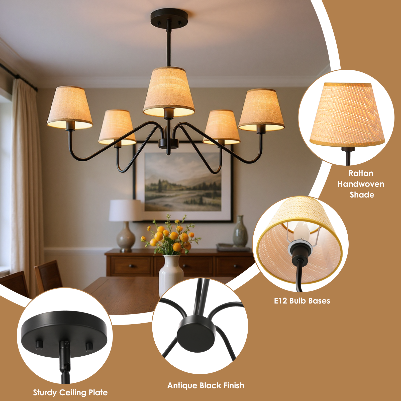 【Boho Rattan Chandelier】This 5-light farmhouse chandelier features a genuine woven rattan shade and modern metal arms. The elegant black-finished frame ensures a seamless, polished look—no exposed chains or wires, just rich black tones paired, adding a whimsical yet stylish touch to your space. The boho chandeliers perfect as dining room light fixture, kitchen island lighting, living room chandelier