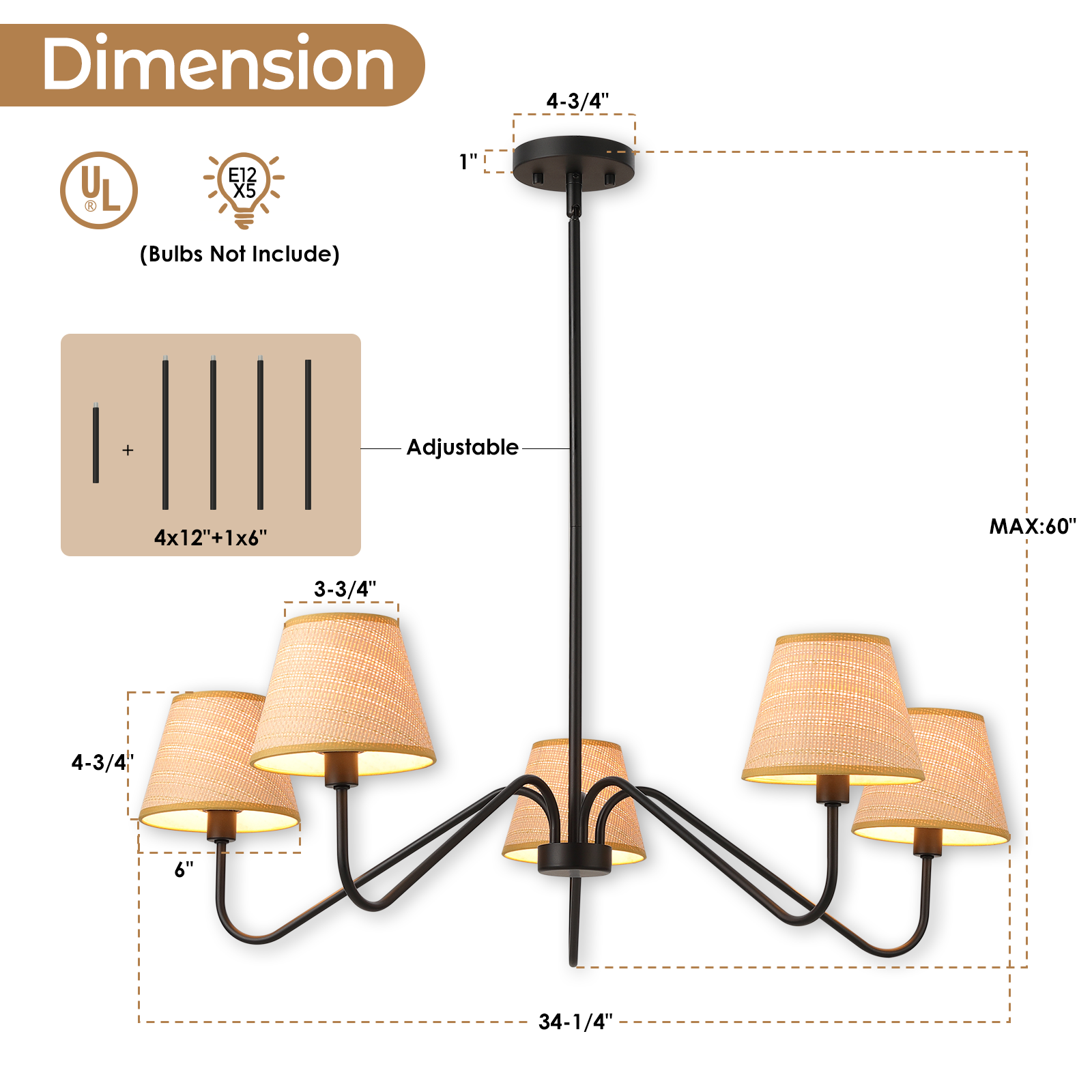 【Large & Adjustable Height】The rattan chandelier: Dia 34.25" x H 60" (max); Lamp body: Dia 34.25" x H 9.5"; Canopy: Dia 4.75" x H 1" .This dining table light fixture with DIY Adjustable rod for easy customizing your lighting needs, included 4 x 12" and 1 x 6" metal rod, Overall length: 60". You can hang higher or lower as you want, perfect for flat and sloped ceilings, coastal chandelier for kitchen island living room hallway bathroom
