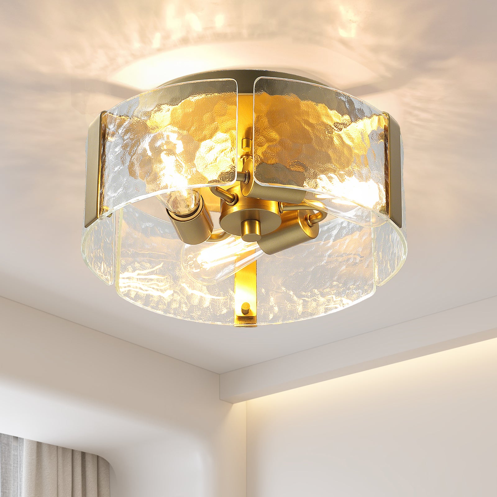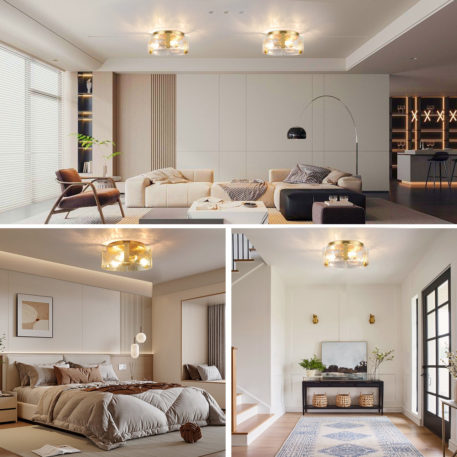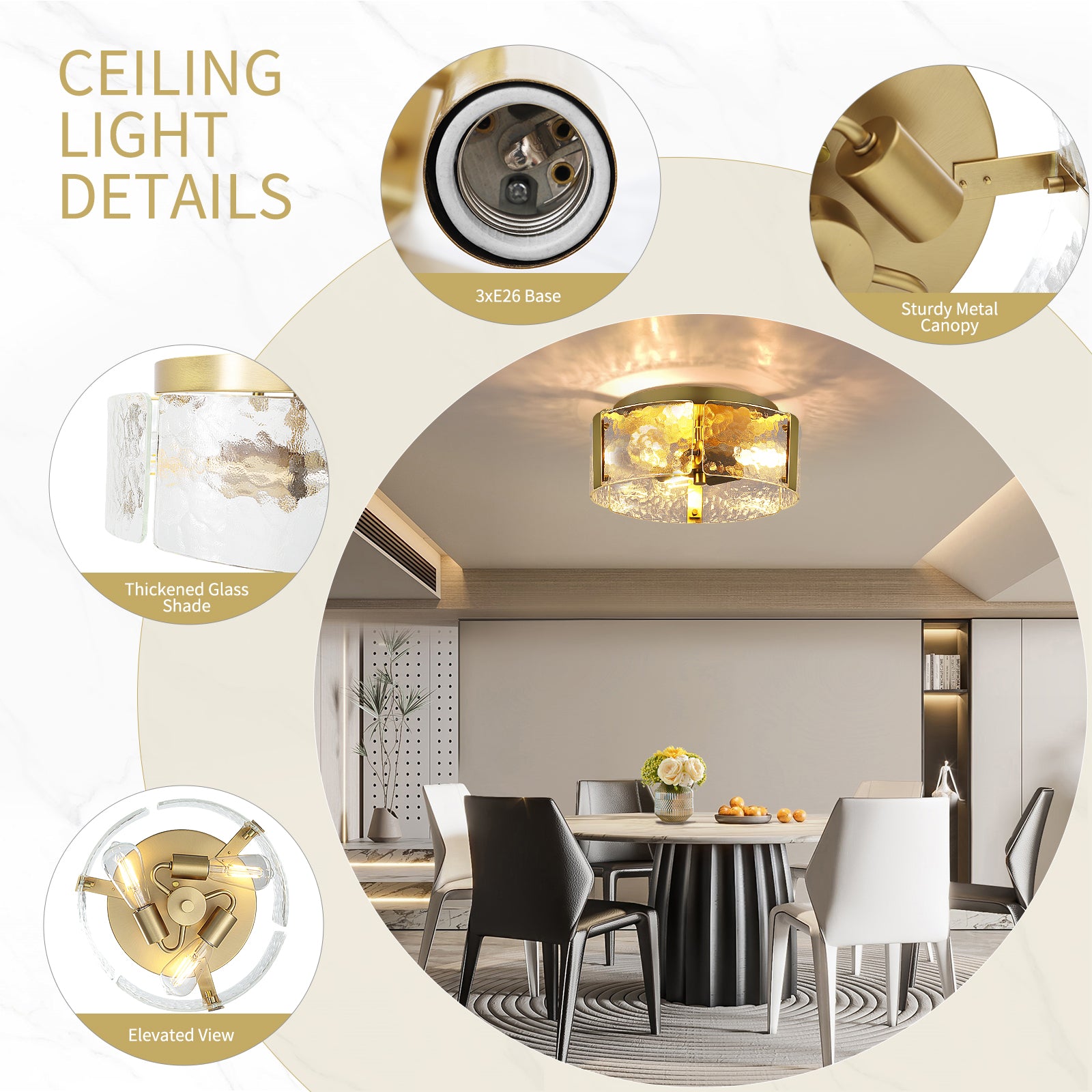 ✅【MODERN SEMI-FLUSH MOUNT DESIGN】This gold semi flush mount ceiling light fixture is made of high-quality metal and thciken elegant water ripple glass shade, the glass ceiling light adopts excellent baking varnish process, outstanding oxidation resistance, hard to rust. Fine workmanship, durable in use. The 3 light sources become bright, soft and comfortable under the reflection of the water ripple glass, presenting a warm dining atmosphere. The close to ceiling light fixture complement any décor from industrial to farmhouse adding modern touch to your space.