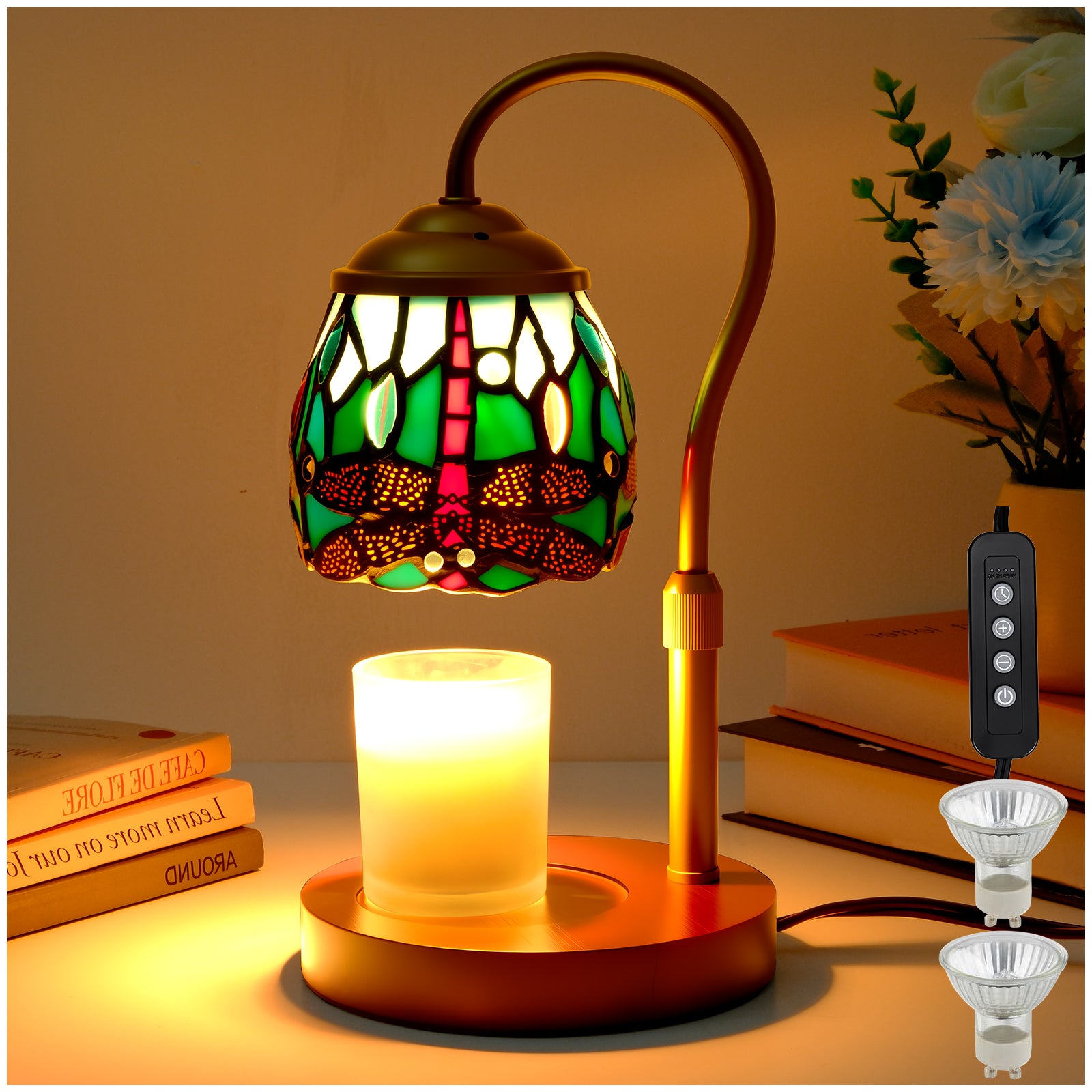 LIBOZMKO Tiffany Style Candle Warmer Lamp with Timer, Dimmable Dragonfly Stained Glass Candle Lamp Warmer, Vintage Candle Light for Scented Candles with 2 Bulbs