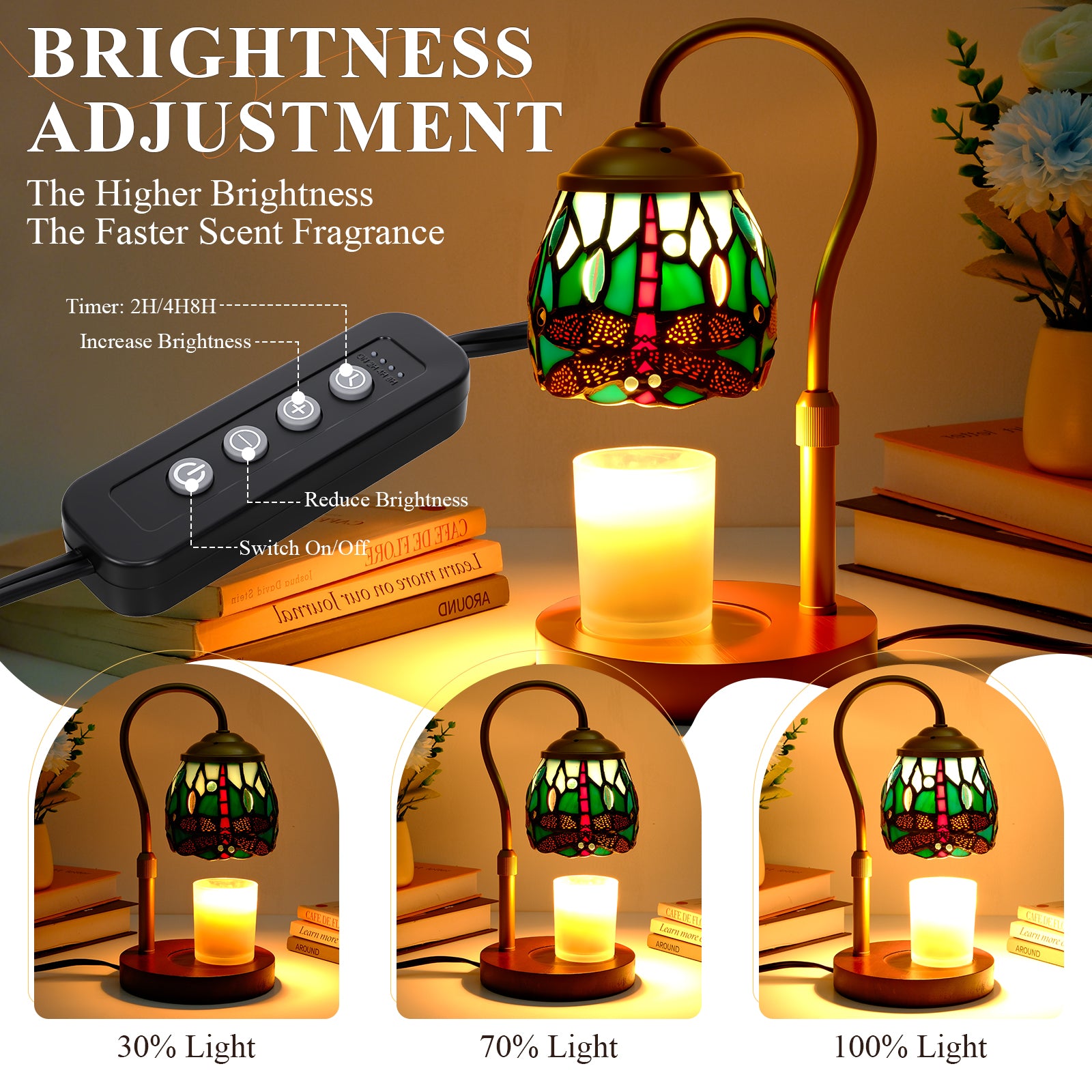 Timer and Brightness Adjustable: The candle warmer lamp has a built-in timer, you can set the 2H/4H/8H hour off function and the stained glass candle lamp will automatically turn off after the set time. With the dimmer control of the candle warmer, you can short press brightness+/- to adjust the brightness modes (30%-50%-70%-100%), control the melting speed of candles based on the adjustable brightness